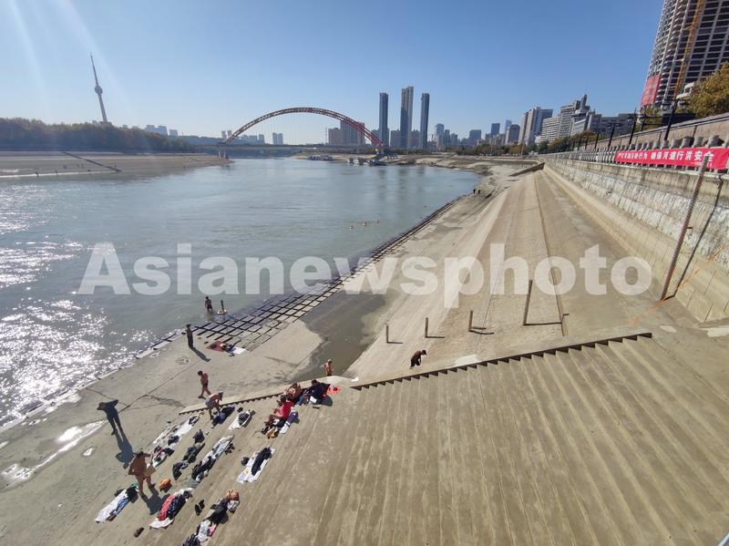 图片说明:11月24日,位于长江汉江交汇的汉口龙王庙水域的泥砂显露成斜坡,保护堤坡墙体坡水面全部见底,对出汉江入长江船舶航行安全带来影响。