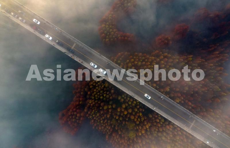 图片说明:2021年11月27日,在江苏省淮安市盱眙县天泉湖拍摄的晨雾缭绕下的红杉林景色(无人机照片)。
