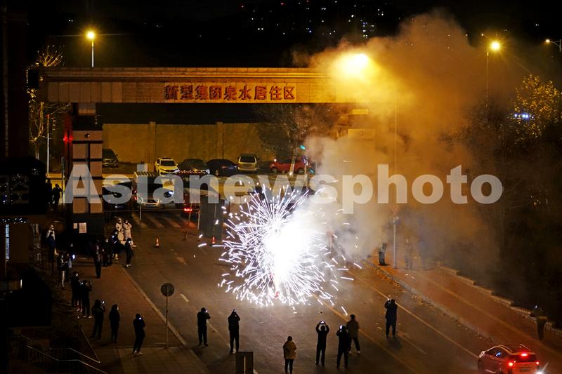 2021年11月28日夜,大连市甘井子区泉水街道龙鑫社区居民燃放焰花庆祝解封。