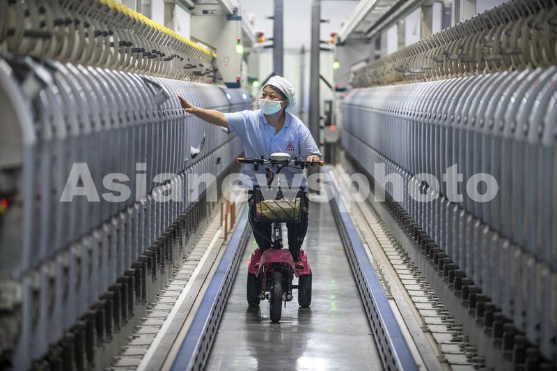 图片说明:2021年11月29日,浙江省兰溪市浙江万舟控股集团有限公司生产车间里,一排排喷气织机在高速运转,一位工人骑着电动车穿梭来回巡视,进行智能化操作。