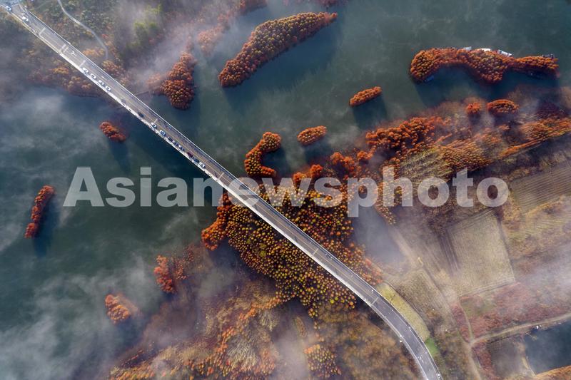 图片说明:2021年11月27日,在江苏省淮安市盱眙县天泉湖拍摄的晨雾缭绕下的红杉林景色(无人机照片)。