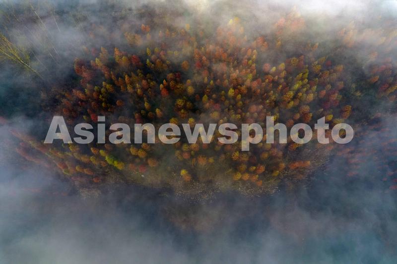 图片说明:2021年11月27日,在江苏省淮安市盱眙县天泉湖拍摄的晨雾缭绕下的红杉林景色(无人机照片)。