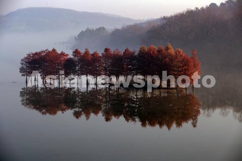 图片说明:2021年11月27日,在江苏省淮安市盱眙县天泉湖拍摄的晨雾缭绕下的红杉林景色。