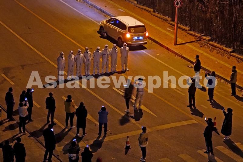 2021年11月28日夜,昼夜把守大连市甘井子区泉水街道华泉街南大门20余天的8名“大白”集体合影。
