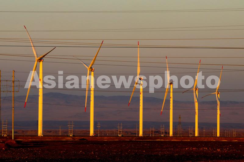 图片说明:2021年11月30日,在新疆哈密市伊吾县拍摄的大唐淖毛湖风电场。