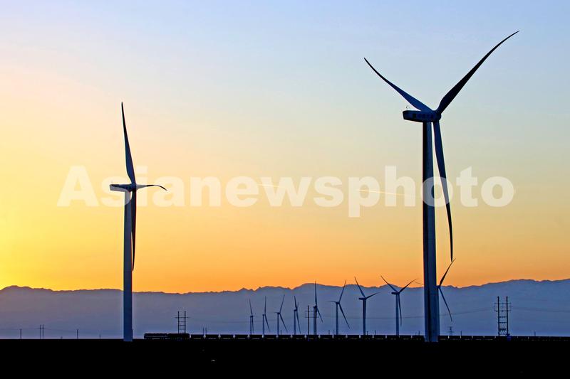 图片说明:2021年11月30日,在新疆哈密市伊吾县拍摄的大唐淖毛湖风电场。