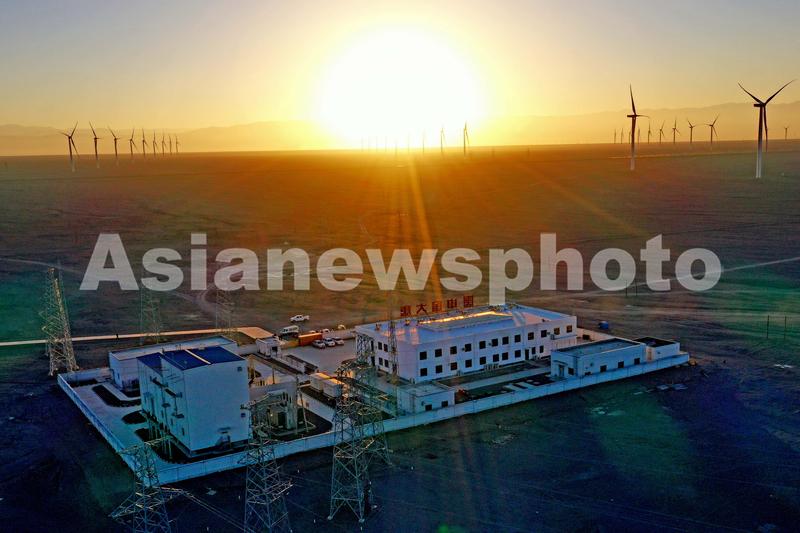 图片说明:2021年11月30日,在新疆哈密市伊吾县拍摄的大唐淖毛湖风电场。