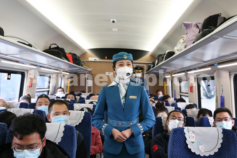 2021年12月3日,从昆明出发的中老铁路首发列车上,身着“丝路花语”主题制服的列车员为乘客服务。