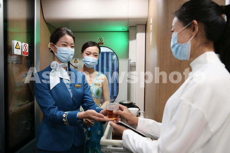 2021年12月3日,从昆明出发的中老铁路首发列车上,身着“丝路花语”主题制服的列车员为乘客服务。