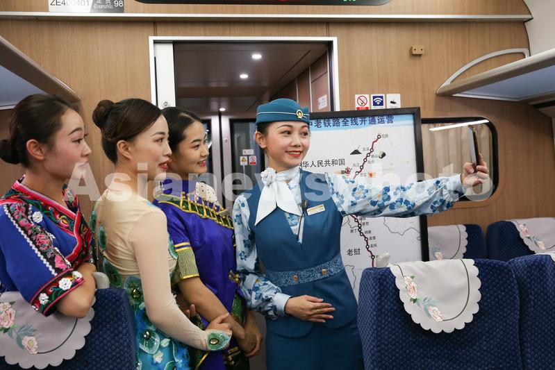 2021年12月3日,从昆明出发的中老铁路首发列车上,列车员合影留念。