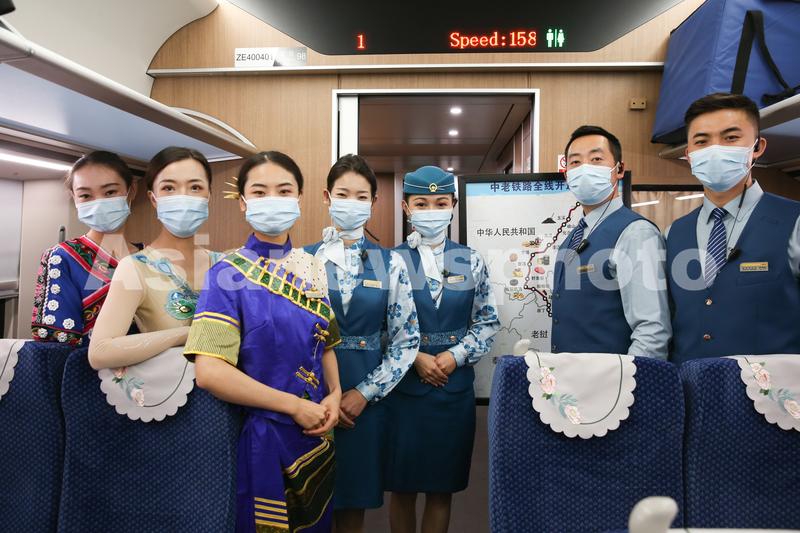 2021年12月3日,从昆明出发的中老铁路首发列车上,列车员合影留念。