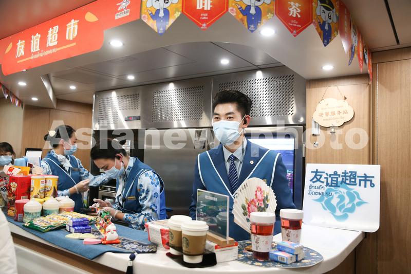 2021年12月3日,从昆明出发的中老铁路首发列车上,身着“丝路花语”主题制服的列车员为乘客服务。