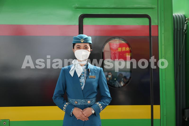 2021年12月3日,从昆明出发的中老铁路首发列车旁,身着“丝路花语”主题制服的列车员。