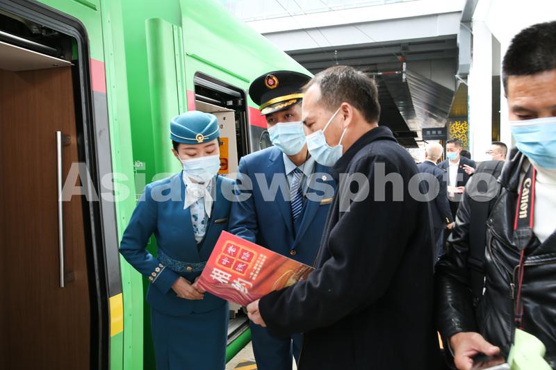 2021年12月3日,从昆明出发的中老铁路首发列车车门旁,身着“丝路花语”主题制服的列车员为乘客服务。