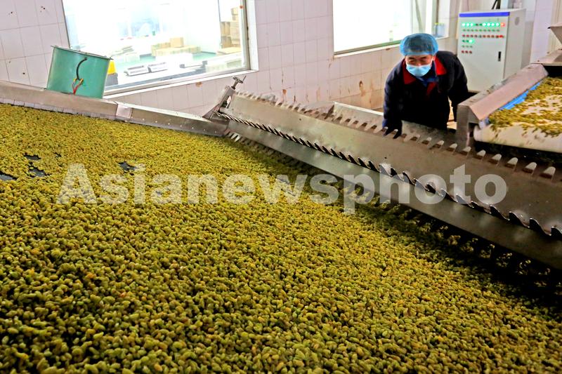 2021年12月6日,工人在新疆吐鲁番市高昌区新城片区新城西门村科技民生产业园葡萄干加工车间分拣葡萄干。