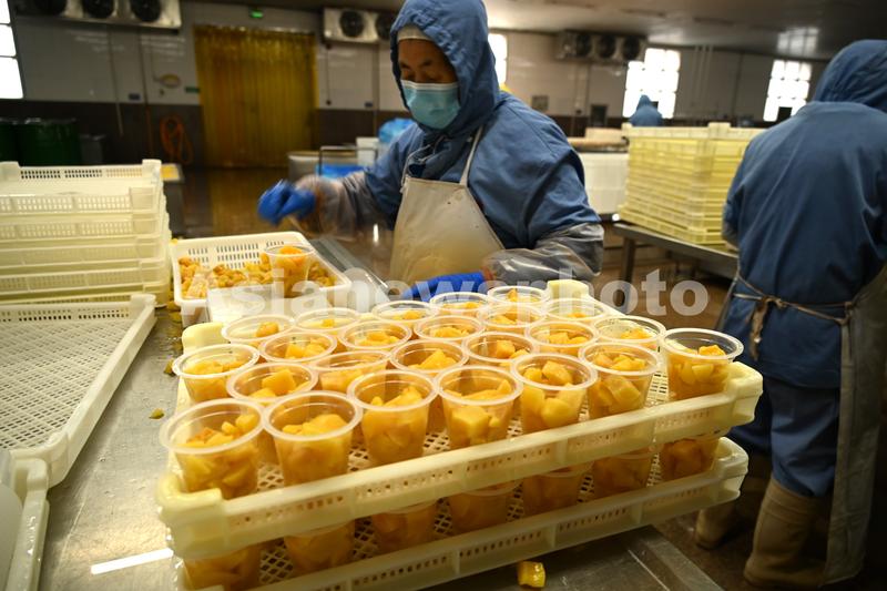 图片说明:2021年12月8日,山东省荣成市石岛管理区嘉源食品有限公司果杯系列生产车间,工人在日本塑料杯罐头设备生产线加工软包装水果罐头。