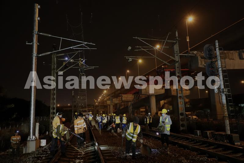 2021年12月9日凌晨,中铁电气化局技术人员正在进行接触网调整施工。
