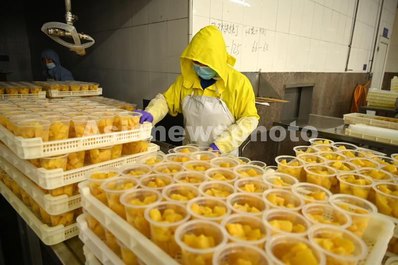 图片说明:2021年12月8日,山东省荣成市石岛管理区嘉源食品有限公司果杯系列生产车间,工人在日本塑料杯罐头设备生产线加工软包装水果罐头。