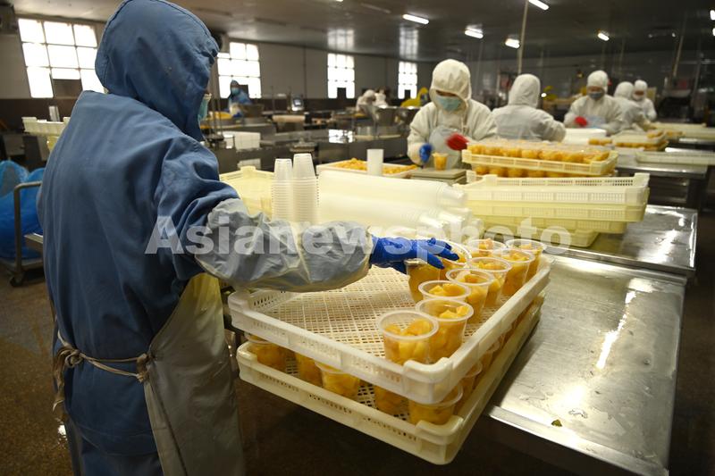 图片说明:2021年12月8日,山东省荣成市石岛管理区嘉源食品有限公司果杯系列生产车间,工人在日本塑料杯罐头设备生产线加工软包装水果罐头。