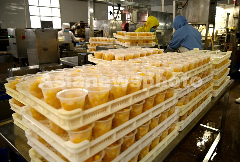图片说明:2021年12月8日,山东省荣成市石岛管理区嘉源食品有限公司果杯系列生产车间,工人在日本塑料杯罐头设备生产线加工软包装水果罐头。