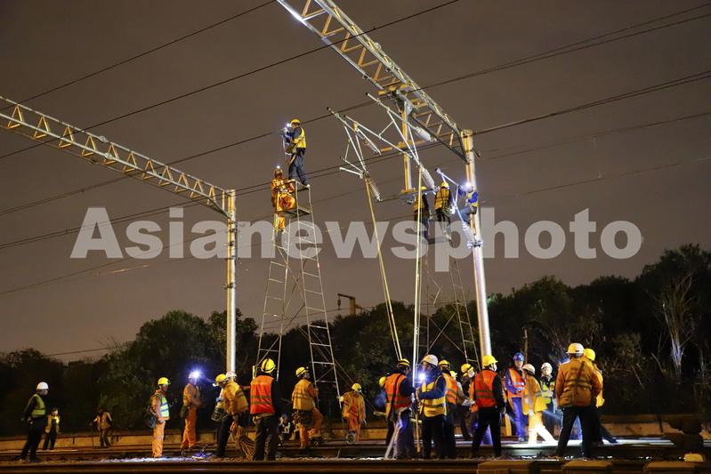 2021年12月9日凌晨,中铁电气化局技术人员正在进行接触网调整施工。