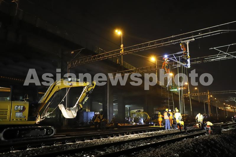 2021年12月9日凌晨,中铁电气化局技术人员正在进行接触网调整施工,同步进行道砟回填。