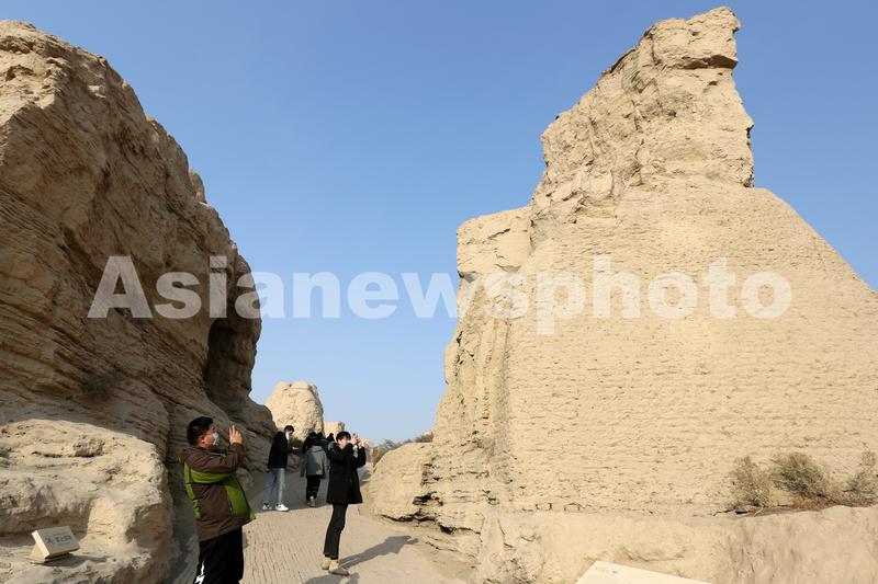图片说明:2021年12月8日,游客在新疆吐鲁番市高昌区交河故城参观。