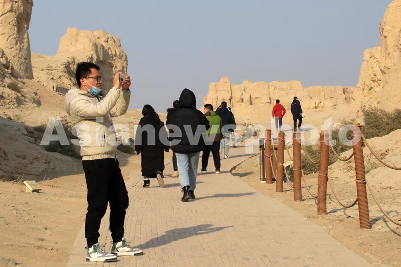 图片说明:2021年12月8日,游客在新疆吐鲁番市高昌区交河故城参观。