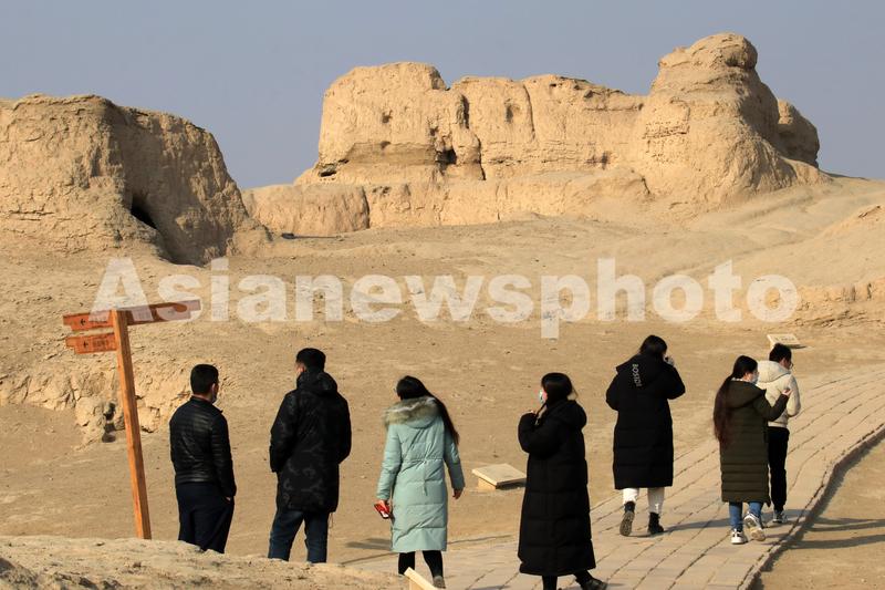 图片说明:2021年12月8日,游客在新疆吐鲁番市高昌区交河故城参观。