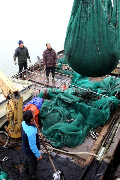 2021年12月11日,连云港市连岛中心渔业码头,刚刚收割的新鲜条斑紫菜在卸船装车运往加工厂。