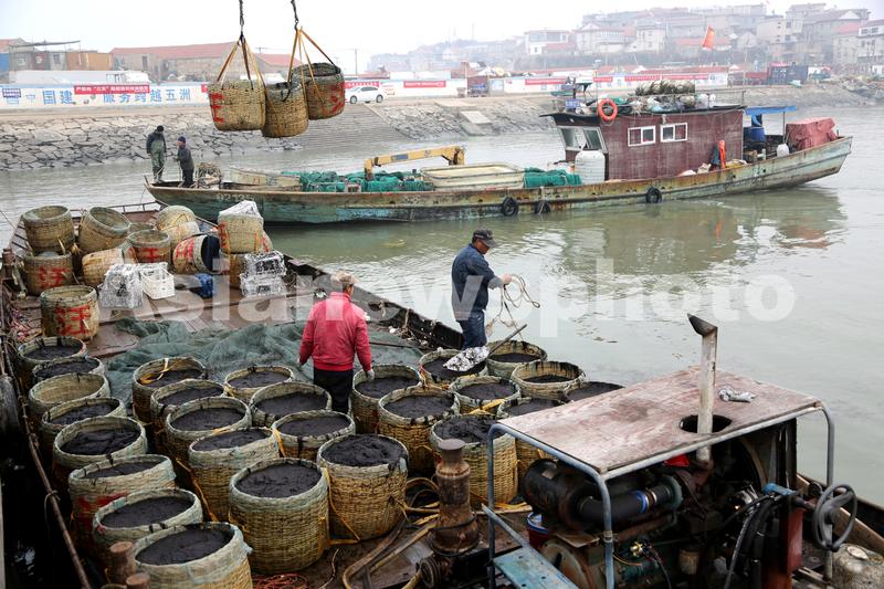 2021年12月11日,连云港市连岛中心渔业码头,刚刚收割的新鲜条斑紫菜在卸船装车运往加工厂。