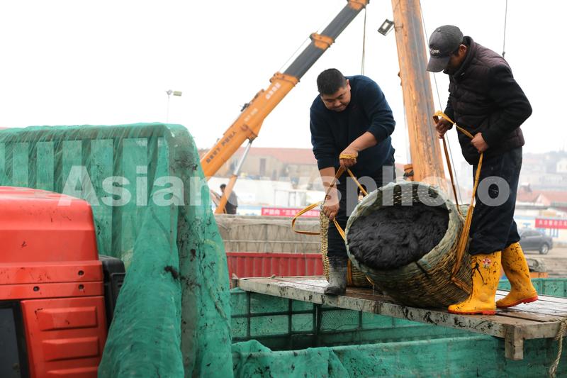 2021年12月11日,连云港市连岛中心渔业码头,刚刚收割的新鲜条斑紫菜在卸船装车运往加工厂。