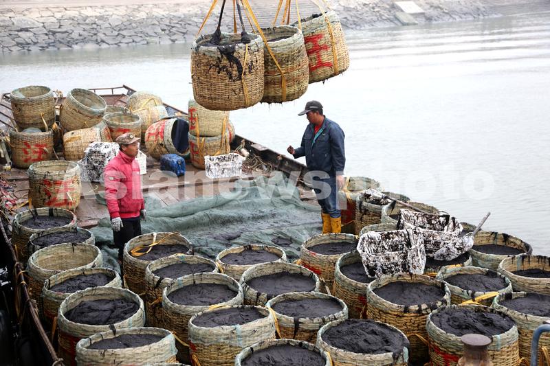 2021年12月11日,连云港市连岛中心渔业码头,刚刚收割的新鲜条斑紫菜在卸船装车运往加工厂。