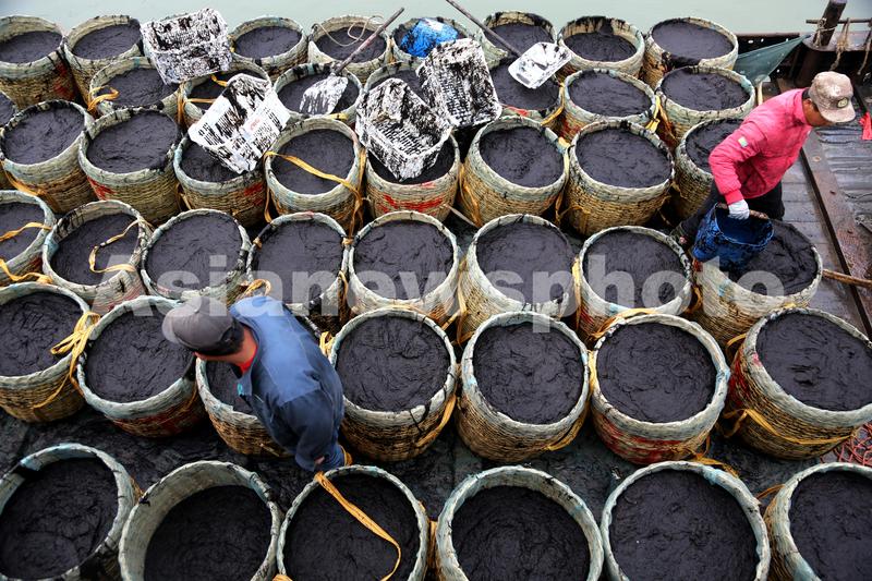 2021年12月11日,连云港市连岛中心渔业码头,刚刚收割的新鲜条斑紫菜在卸船装车运往加工厂。