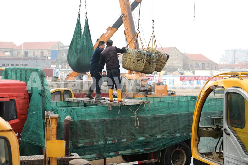 2021年12月11日,连云港市连岛中心渔业码头,刚刚收割的新鲜条斑紫菜在卸船装车运往加工厂。