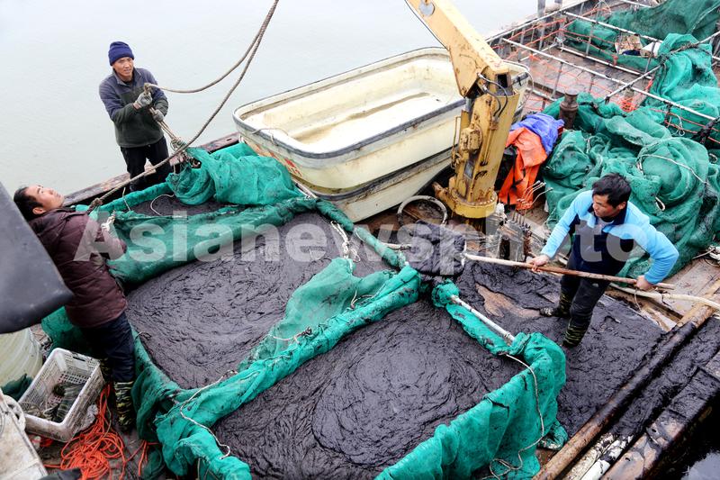 2021年12月11日,连云港市连岛中心渔业码头,刚刚收割的新鲜条斑紫菜在卸船装车运往加工厂。