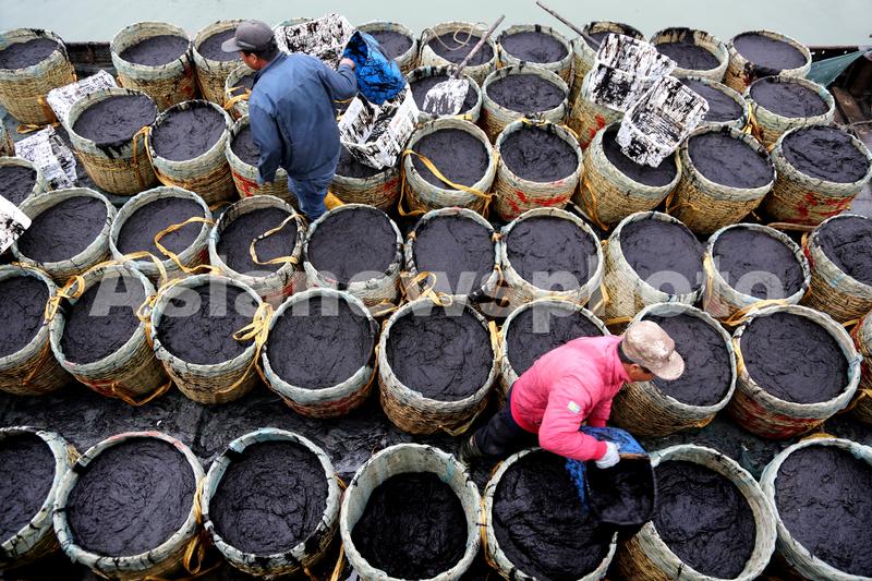 2021年12月11日,连云港市连岛中心渔业码头,刚刚收割的新鲜条斑紫菜在卸船装车运往加工厂。