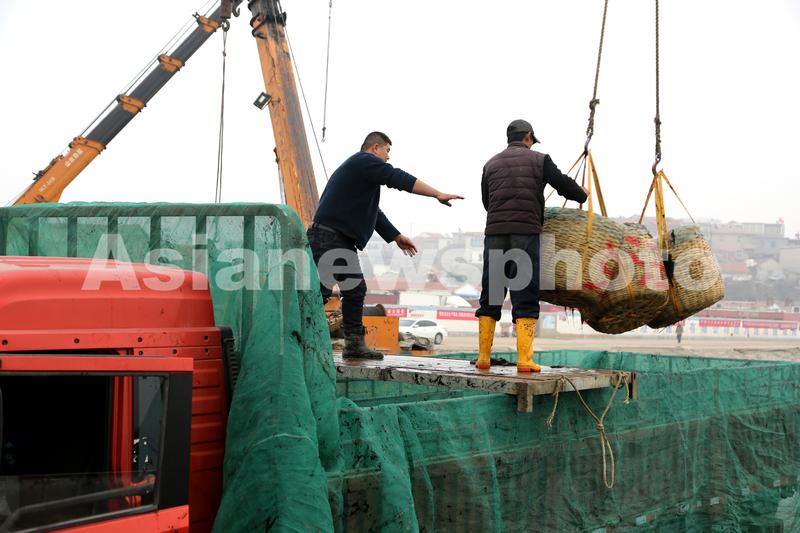 2021年12月11日,连云港市连岛中心渔业码头,刚刚收割的新鲜条斑紫菜在卸船装车运往加工厂。