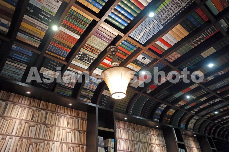 2021年11月28日,上海,位于松江泰晤士小镇的“钟书阁”书店内,咖啡吧天花板的玻璃封印着众多藏书。