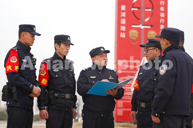 图片说明:2021年12月15日,陕西省渭南市大荔县黄河驿站,所长李超(中)向民警安排巡查走访工作。
