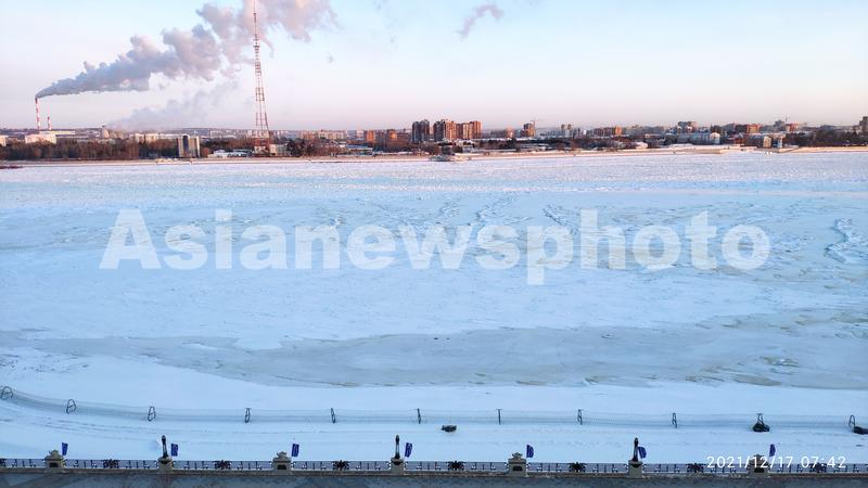 图片说明:2021年12月17日,黑龙江流域黑河市区江段开始封江进入封冻期。