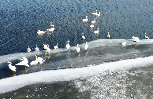 图片说明:2021年12月17日,在河北省张家口市宣化区洋河湿地栖息的白天鹅。