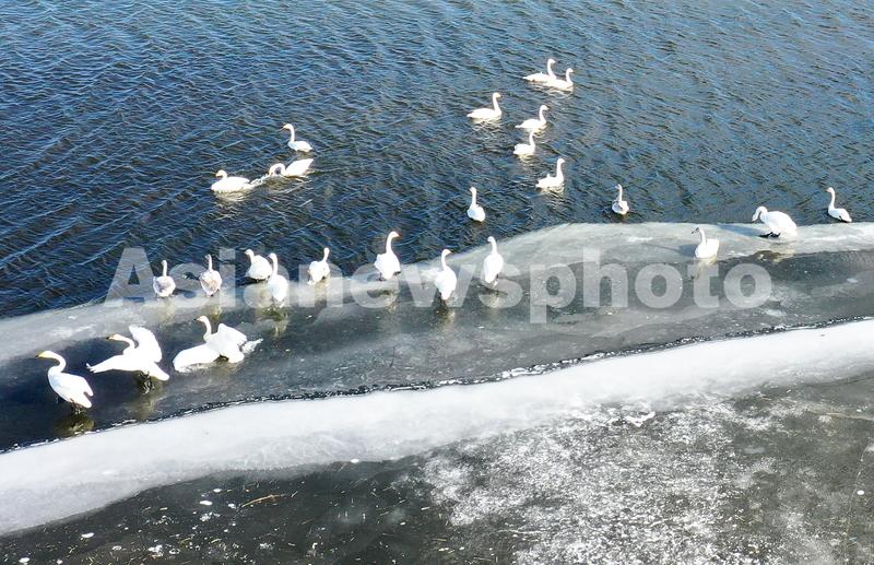 图片说明:2021年12月17日,在河北省张家口市宣化区洋河湿地栖息的白天鹅。