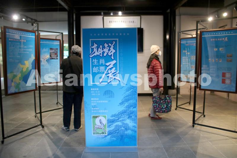 2021年12月21日,观众在江苏苏州生肖邮票博物馆“朝鲜生肖邮票展”上参观。