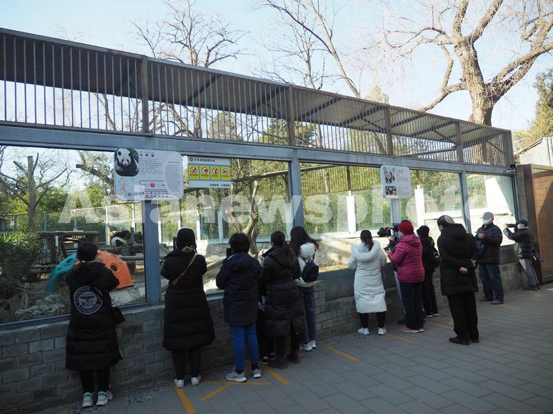 图片说明:2021年12月20日,北京动物园大熊猫馆内,游客们在观赏大熊猫萌兰。