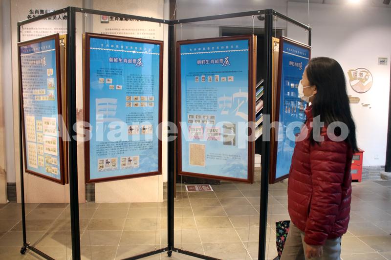 2021年12月21日,观众在江苏苏州生肖邮票博物馆“朝鲜生肖邮票展”上参观。