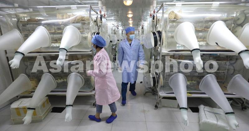 2021年8月13日,中国医学科学院医学实验动物研究所动物实验基地,饲养人员在动物生产车间照护无菌鼠。