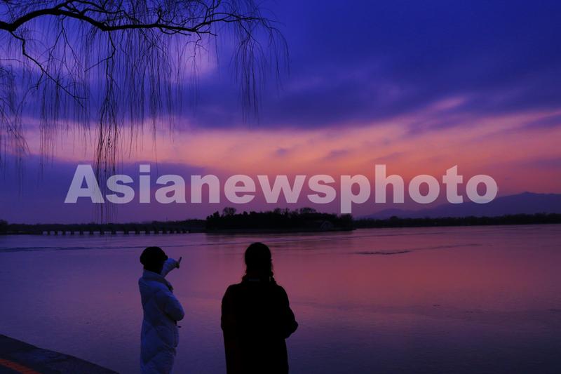 图片说明:2021年12月21日,北京,游客在颐和园欣赏晚霞。