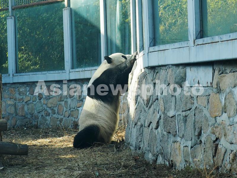 图片说明:2021年12月20日,北京动物园大熊猫萌兰趴在墙上凝望着场外。