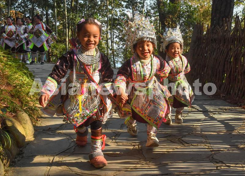 图片说明:12月22日,贵州省从江县丙妹镇岜沙苗寨穿着盛装的苗族小孩。